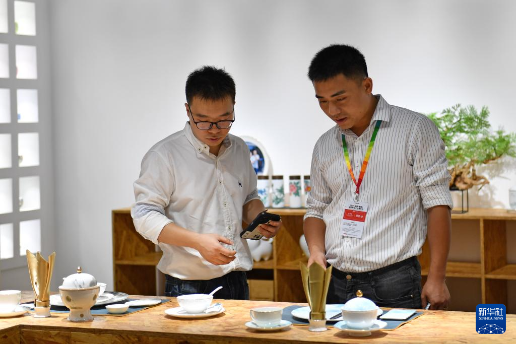 9月29日,参展商在2024湖南(醴陵)国际陶瓷产业博览会上直播推荐产品。