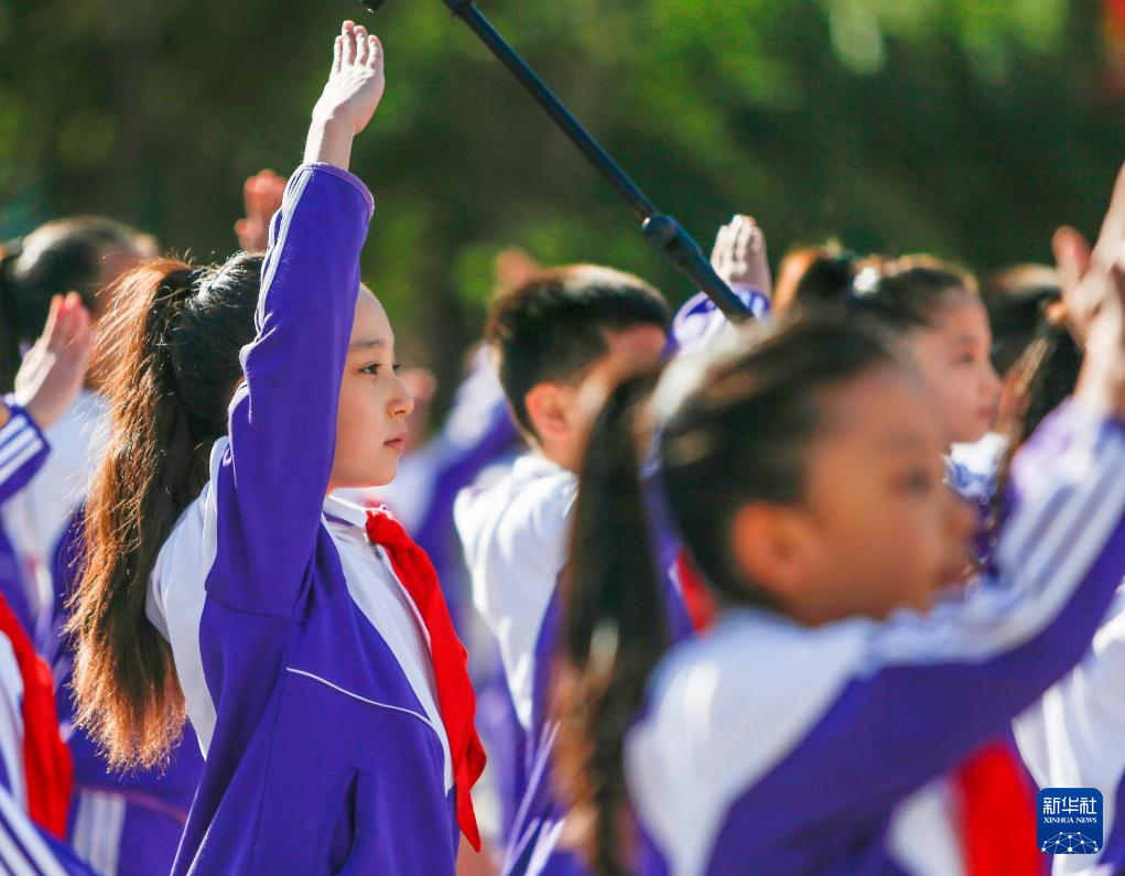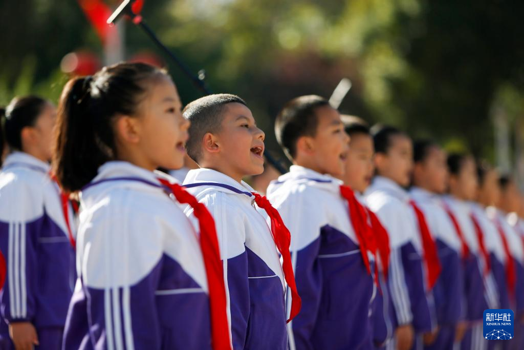 9月30日,在新疆乌鲁木齐人民广场举行的向人民英雄敬献花篮仪式上,少先队员唱响《我们是共产主义接班人》。