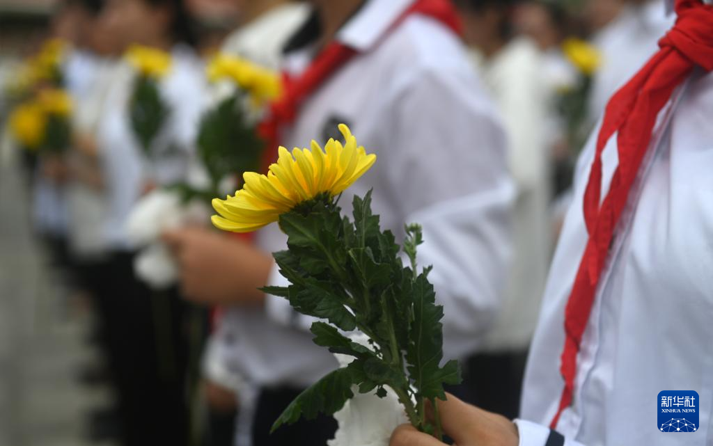 9月30日,在贵州省铜仁市玉屏侗族自治县小凤山烈士陵园,学生向烈士敬献鲜花。