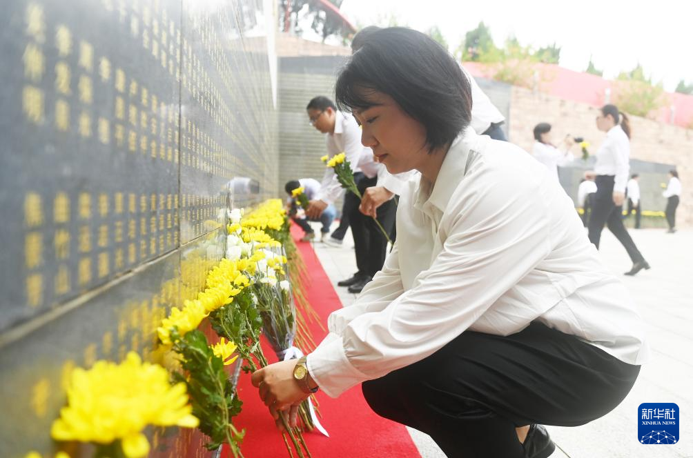 9月30日,在广西壮族自治区烈士陵园,参加纪念活动的人员向英烈敬献鲜花。