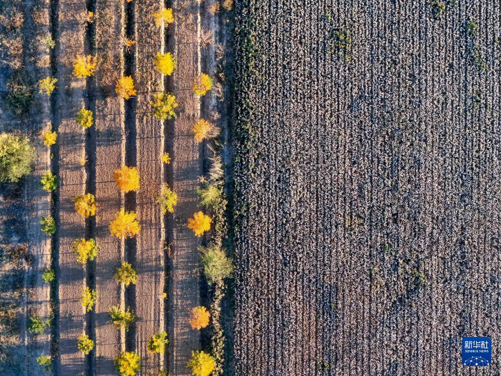 这是9月29日在新疆生产建设兵团第六师五家渠市拍摄的棉田和田边林带(9月29日摄,无人机照片)。