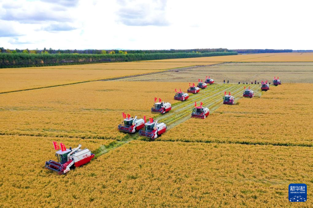 这是9月27日在位于双鸭山市友谊县的北大荒农业股份有限公司友谊分公司拍摄的秋收现场(无人机照片)。