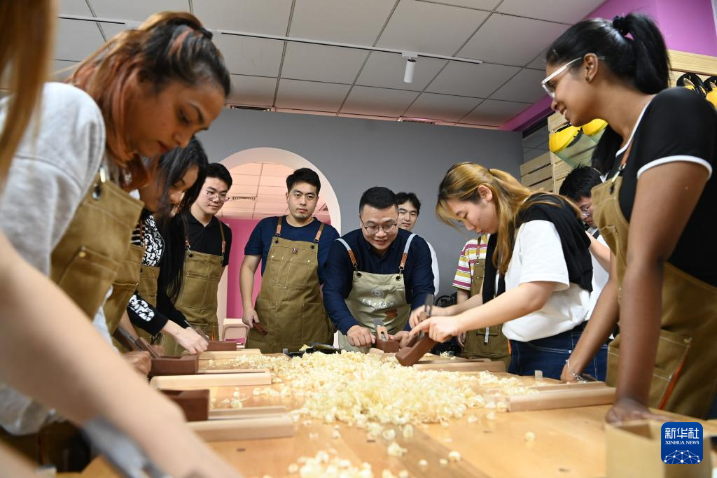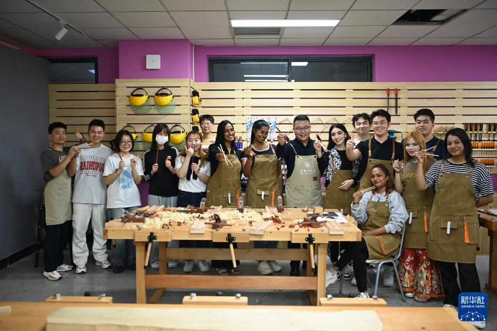 9月28日,郑勇(前右三)在课堂上指导中外学生体验传统漆器制作。