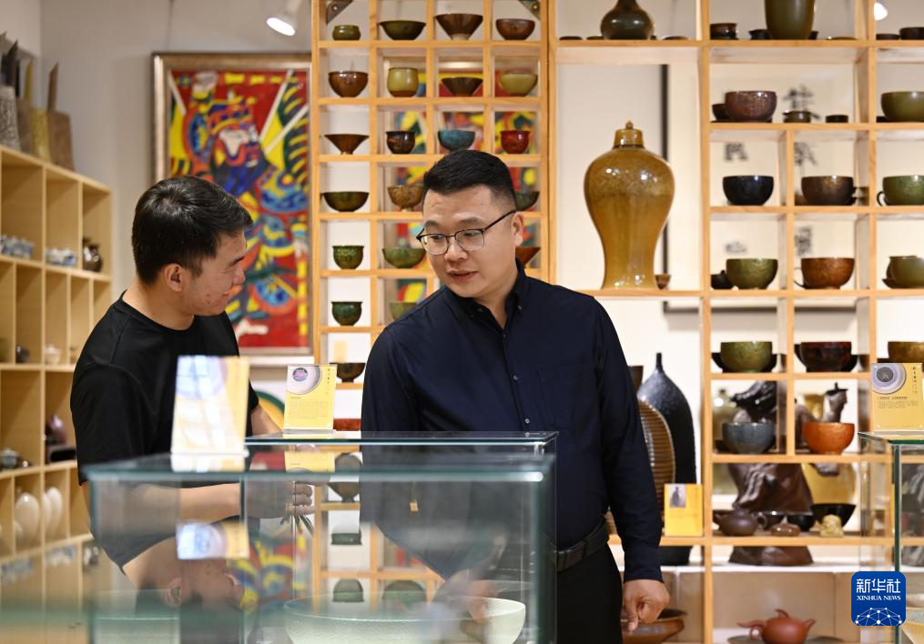 9月29日,郑勇(右)和学生在工作室内讨论一款陶胎漆器作品。