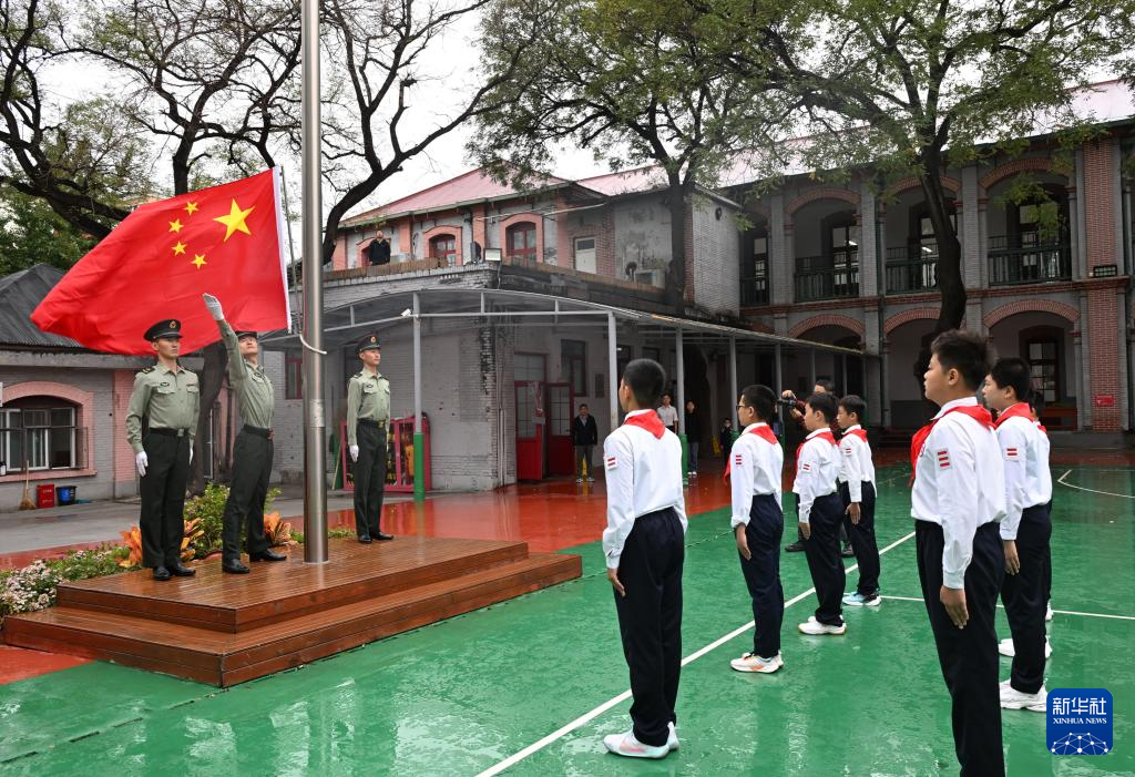 9月30日,北京市西城区京华实验学校学生在校园内与国旗护卫队一起参加升旗仪式。