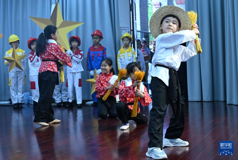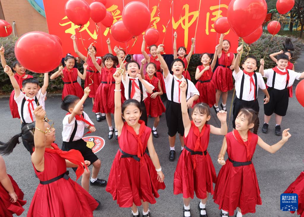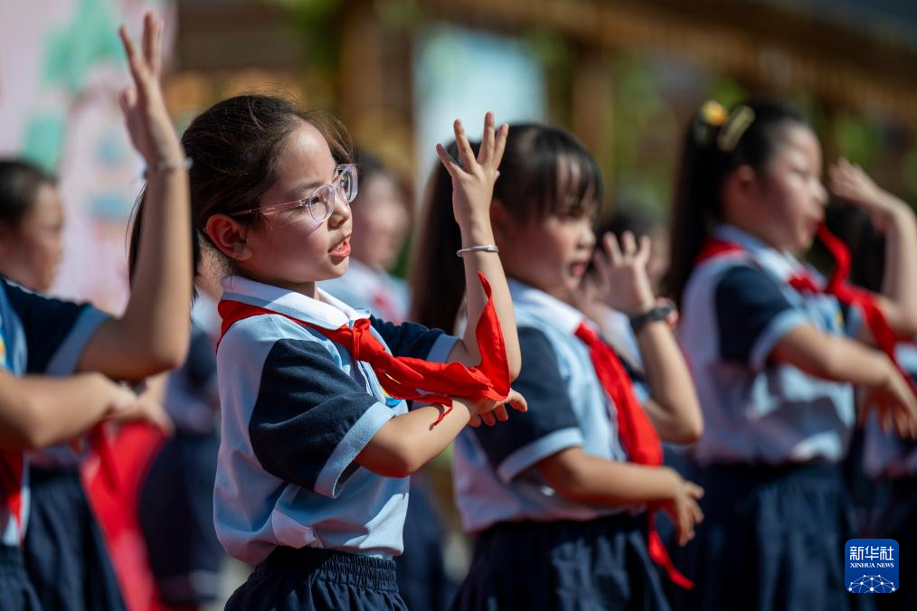 9月30日,湖北省黄石市沈家营小学的小朋友们在迎国庆活动上表演节目。