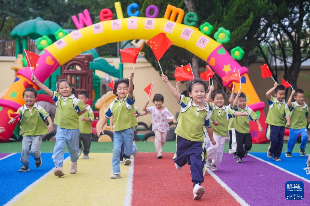 9月30日,小朋友参加山东省青岛市李沧区夏庄路幼儿园开展的迎国庆主题活动。