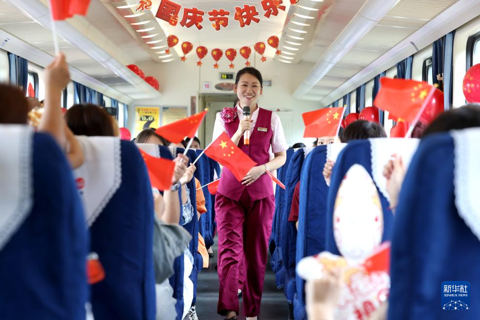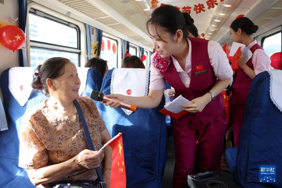 9月30日,在福州开往松溪的K8746次列车上,旅客参与迎国庆互动游戏。
