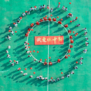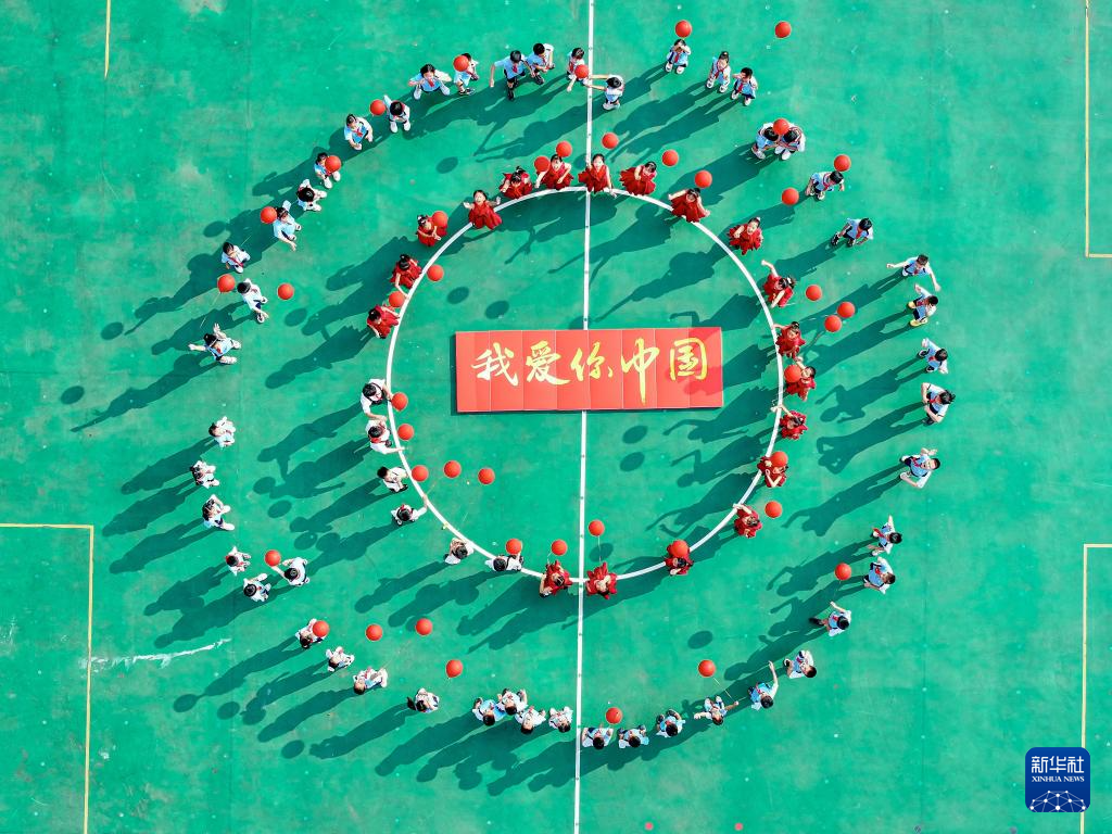9月30日,湖北省武汉市洪山区未来实验小学美林校区学生展示“我爱你中国”横幅,祝福伟大祖国繁荣昌盛(无人机照片)。