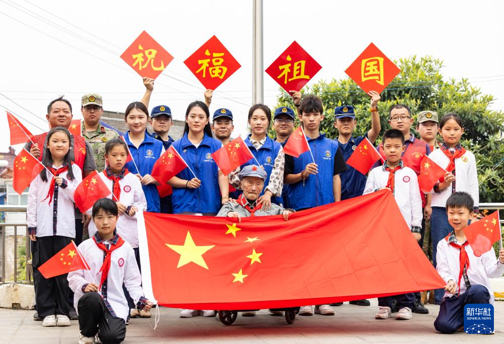 9月30日,江苏省泰州市110岁的老红军吴九成和志愿者们一起与国旗合影。