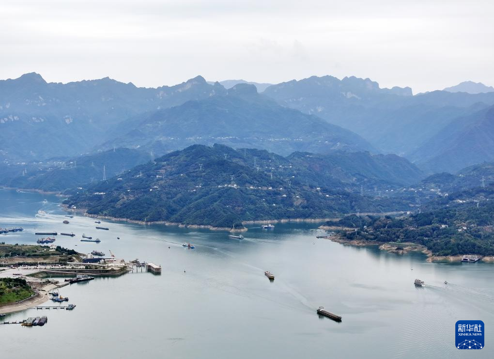 10月1日,船舶行驶在三峡大坝附近的湖北省宜昌市夷陵区太平溪镇水域(无人机照片)。