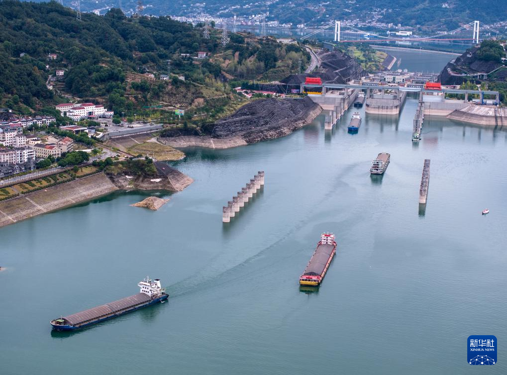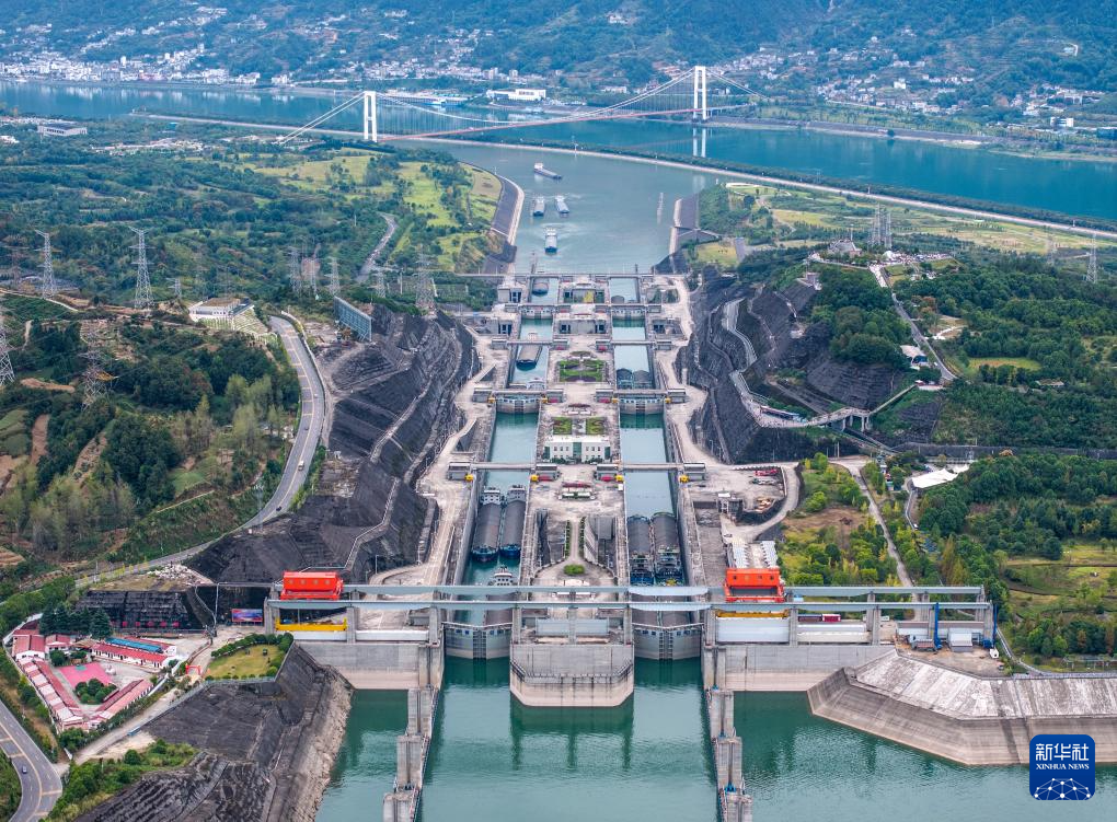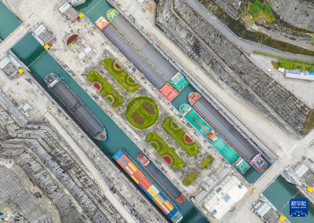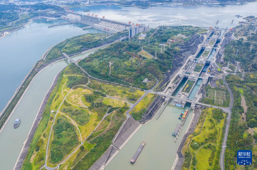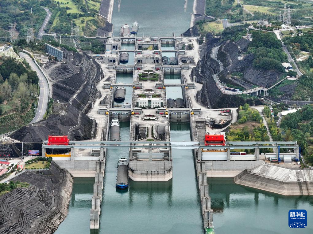 10月1日,船舶有序通过三峡双线五级船闸和升船机(无人机照片)。