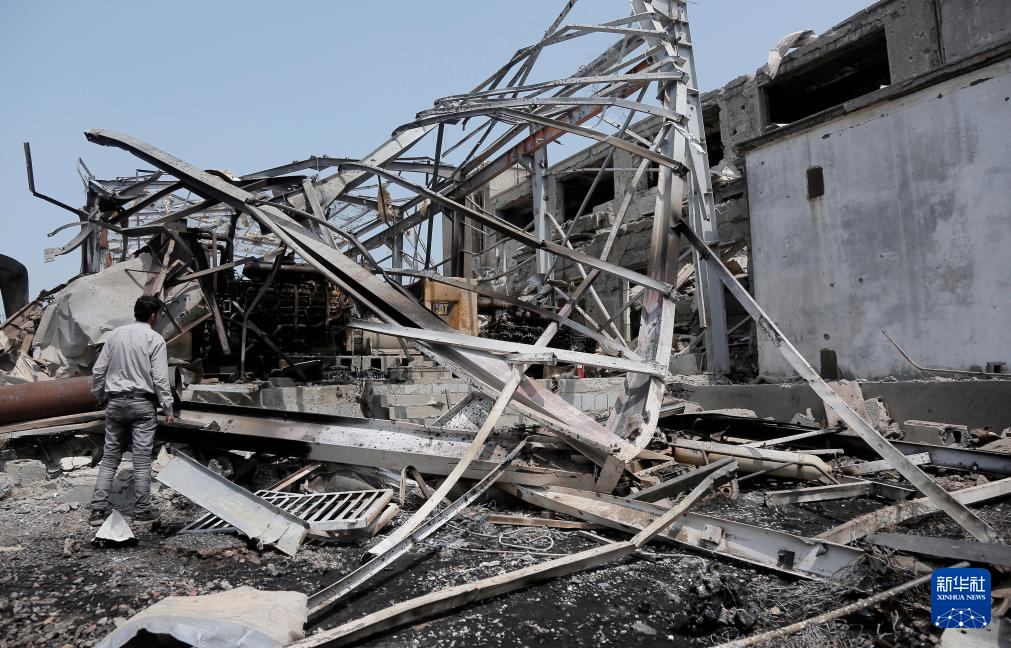 9月30日,在也门荷台达省荷台达市,一名男子走过被以色列空袭摧毁的荷台达港发电站废墟。