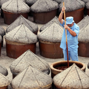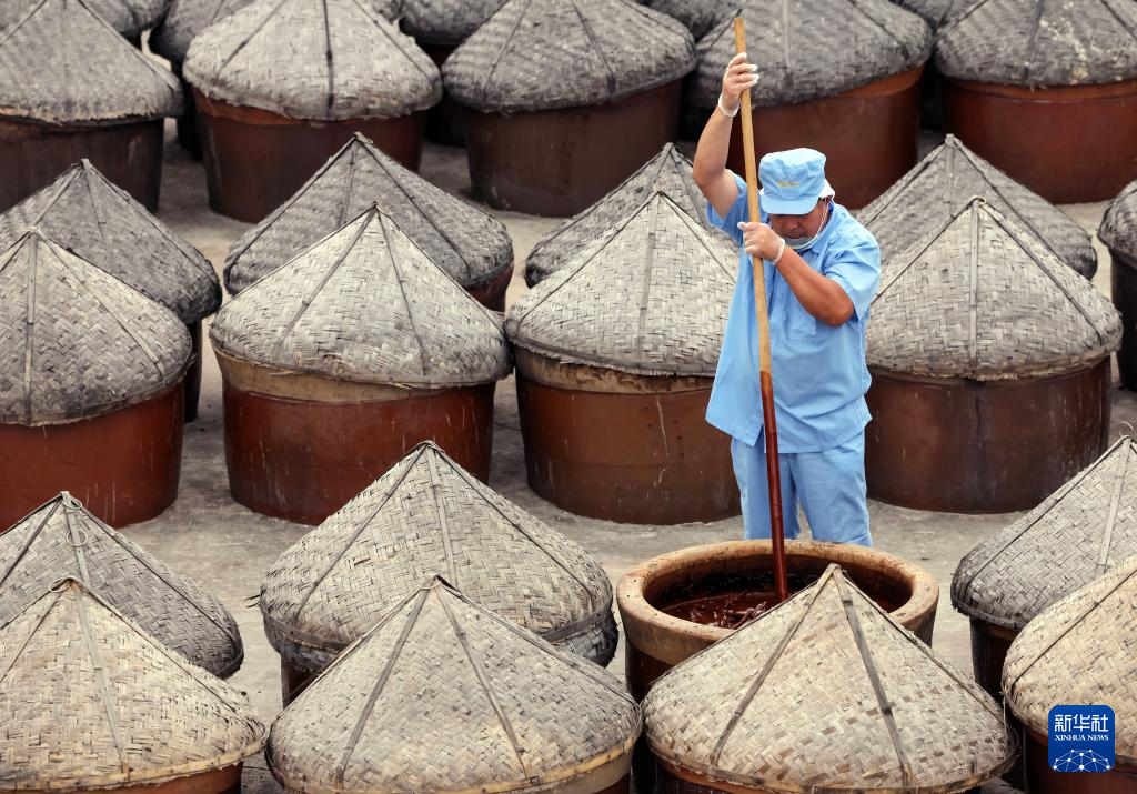 9月29日,六必居酱菜制作技艺传承人王因平师傅在酱缸中“打耙”。