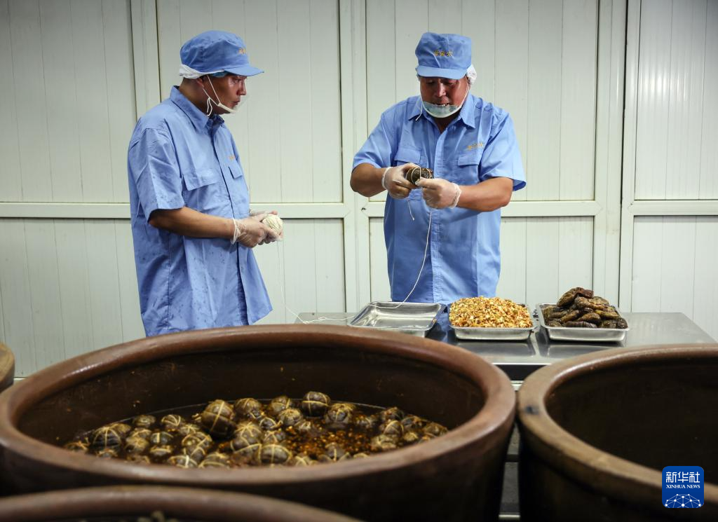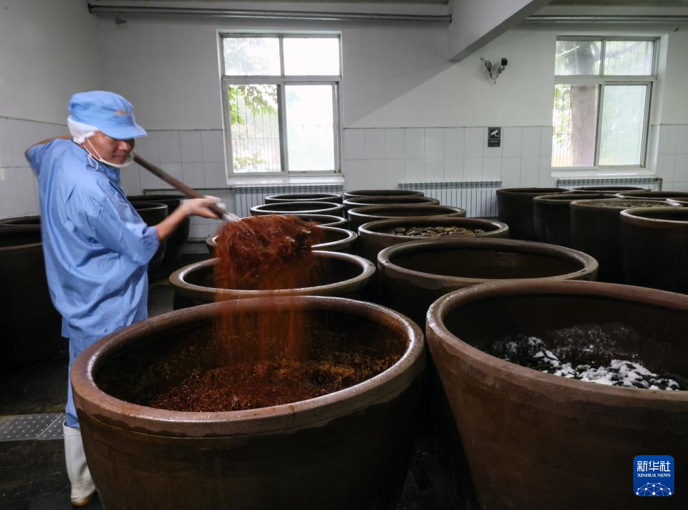 9月29日,车间里的工人师傅给酱菜“麻仁金丝”拌料。