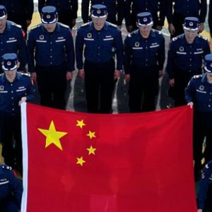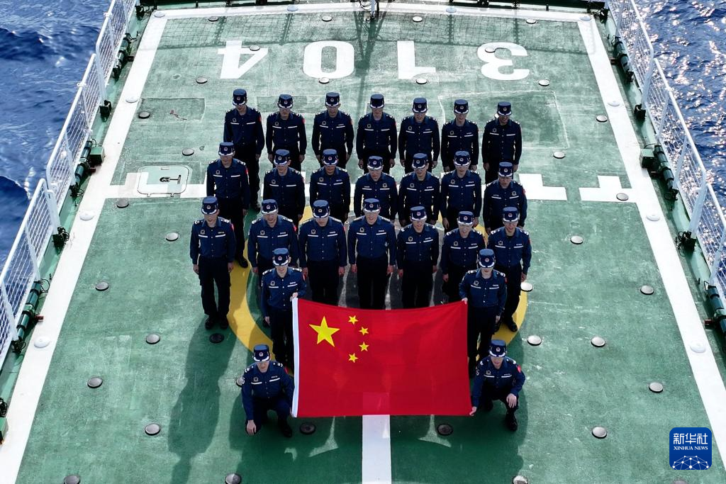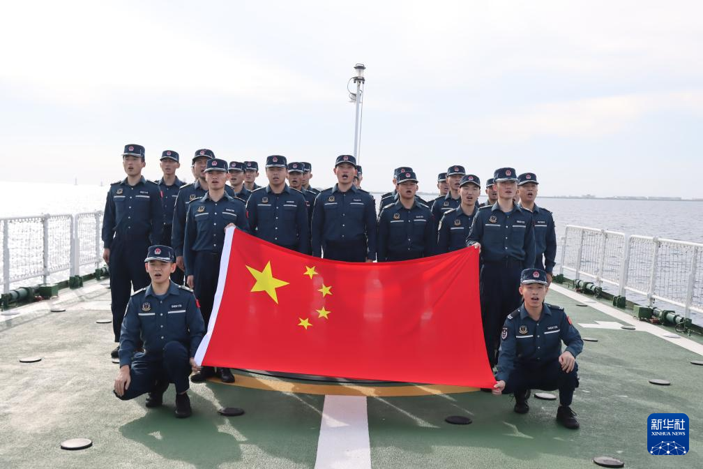 9月25日,在中国南沙美济礁附近,海警南域舰执法员在舰艇后甲板组织祝福祖国活动。