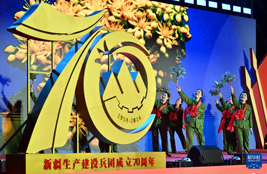 今年是新疆生产建设兵团成立70周年。当日,新疆生产建设兵团第十二师举行2024年百场基层文化活动优秀节目展演,邀请各团场职工走上舞台,表演舞蹈、戏曲、诗歌等,营造喜庆的节日氛围。