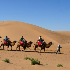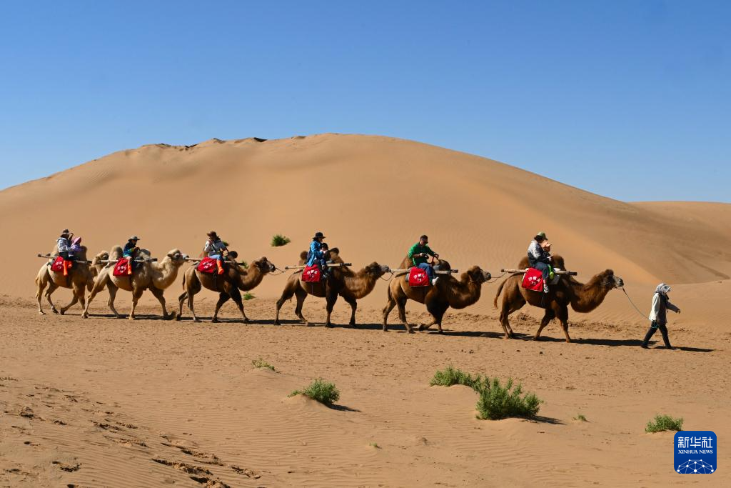 10月1日,游客在宁夏中卫市沙坡头景区骑骆驼。