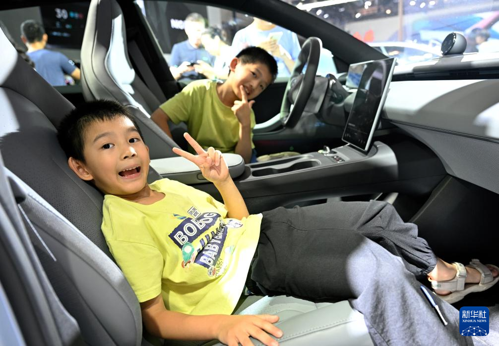 10月1日,小朋友在第44届中国(福州)国际汽车博览会暨第3届中国(福州)国际智能网联汽车体验博览会上体验一款新能源汽车。