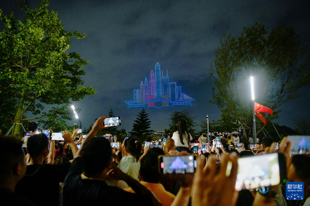 10月1日,市民群众在广东省深圳市笔架山公园观看无人机表演。