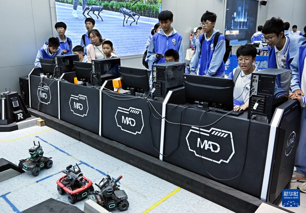 10月1日,中学生在山东青岛人工智能国际客厅参加研学活动。