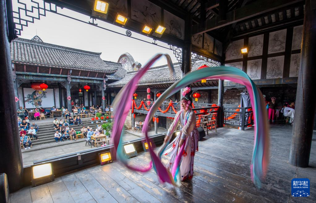 10月1日,在四川省巴中市恩阳古镇,游客观看文艺表演。