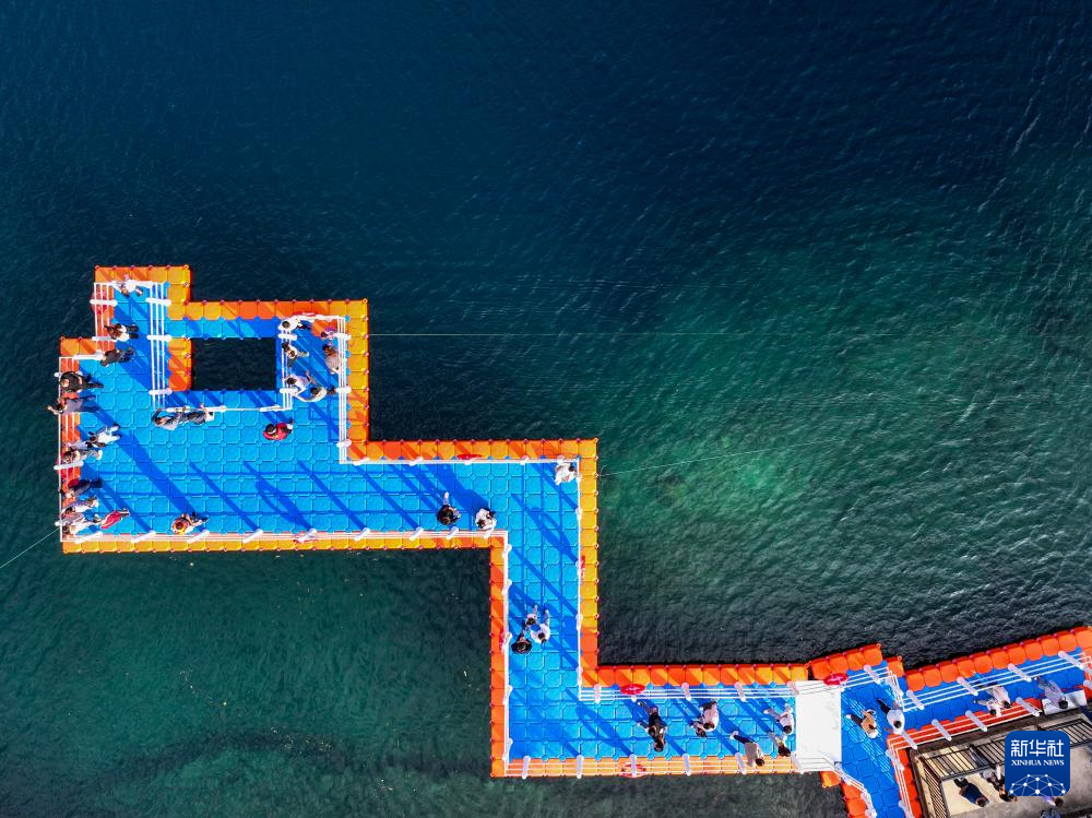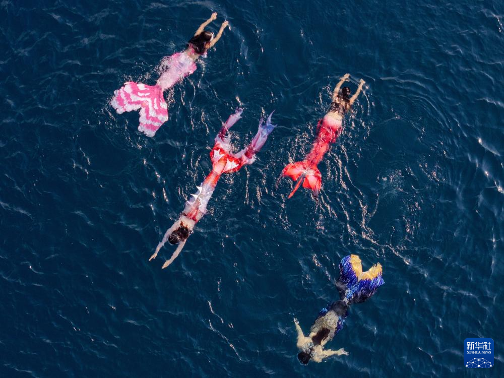 10月1日,演员在位于江苏省淮安市盱眙县的象山国家矿山(地质)公园进行“美人鱼”表演(无人机照片)。
