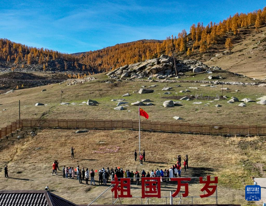 10月1日在新疆阿勒泰边境管理支队乌希里克边境警务站拍摄的升国旗仪式(无人机照片)。