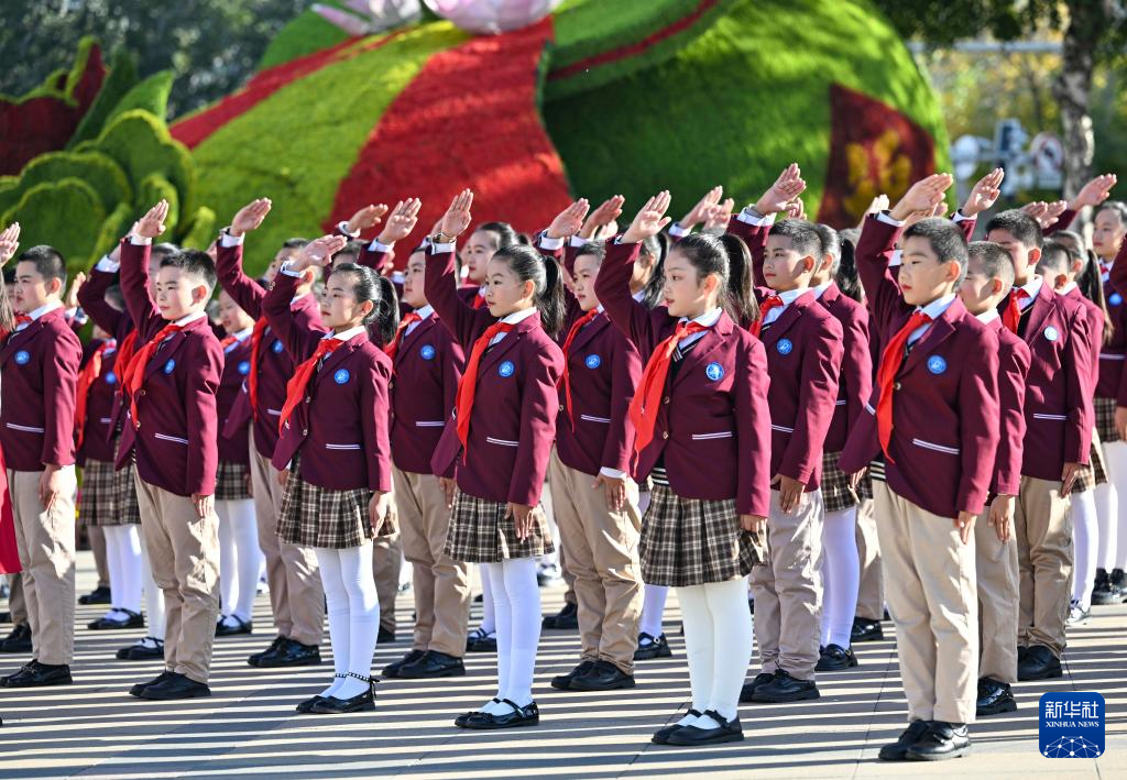 10月1日,在乌鲁木齐市人民广场,少先队员在新疆维吾尔自治区庆祝中华人民共和国成立75周年升国旗仪式上献词。