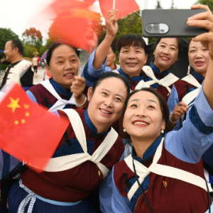 10月1日,在云南省丽江市玉龙纳西族自治县,人们在升国旗仪式后合影留念。