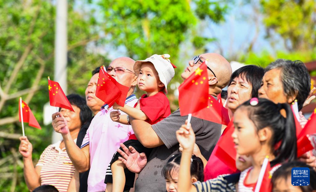 10月1日,在海南省文昌市锦山镇厚禄村举行的升旗仪式现场,人们挥舞国旗,祝福祖国。受9月超强台风“摩羯”影响,当地受灾严重,目前群众生产生活秩序已逐渐恢复。