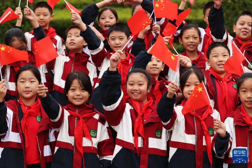 10月1日,在重庆市黔江区大众广场的升国旗仪式现场,少先队员挥舞国旗,祝福祖国。