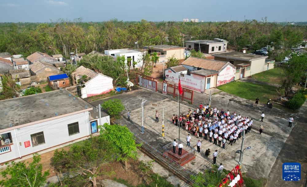10月1日在海南省文昌市锦山镇厚禄村拍摄的升旗仪式现场(无人机照片)。受9月超强台风“摩羯”影响,当地受灾严重,目前群众生产生活秩序已逐渐恢复。
