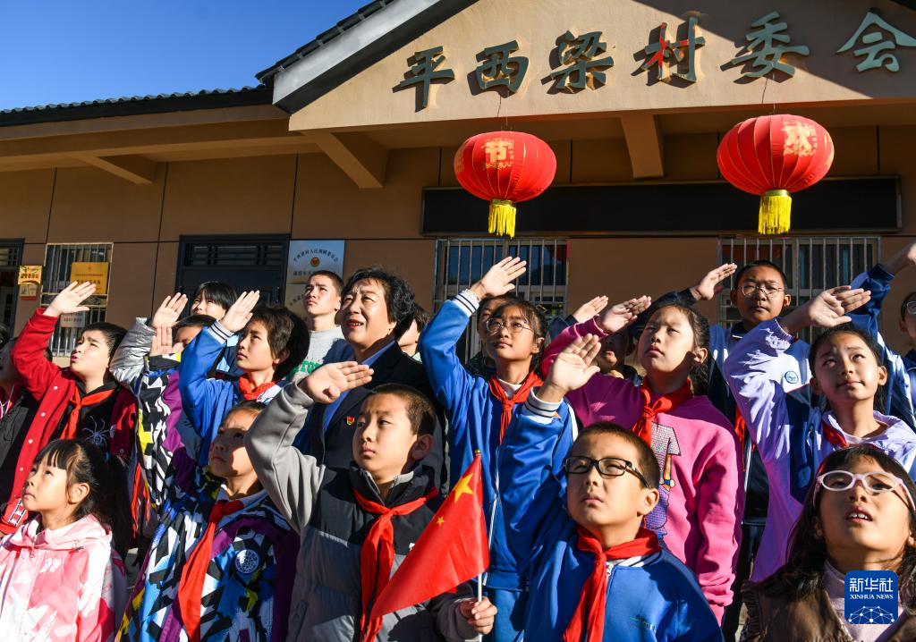 10月1日,在新疆乌鲁木齐市乌鲁木齐县水西沟镇平西梁村,少先队员在升国旗仪式上敬礼。