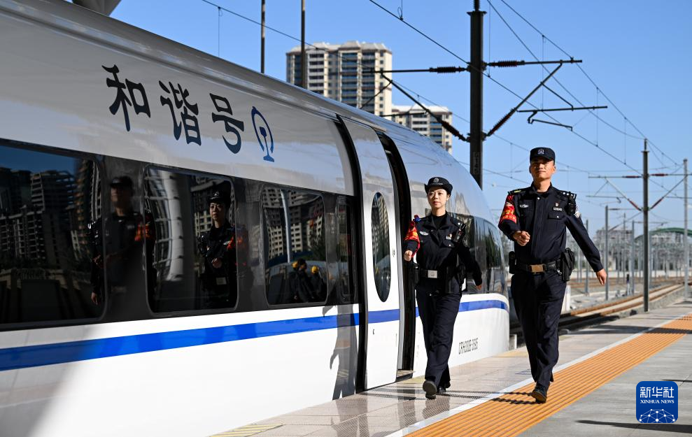 10月1日,在由银川开往惠农的C8218次列车发车前,银川铁路公安处民警在银川站巡逻。