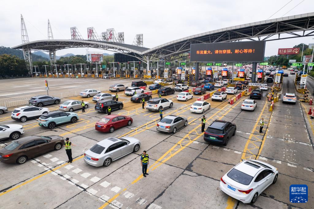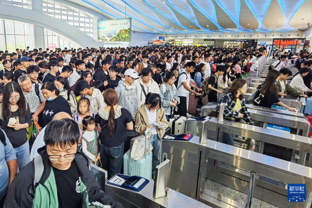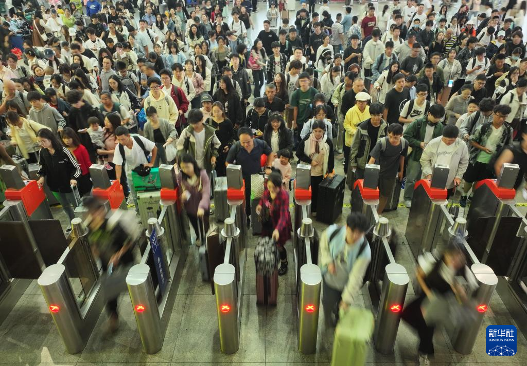 10月1日,旅客在湖南衡阳东站候车室过闸机验票进站乘车(无人机照片)。