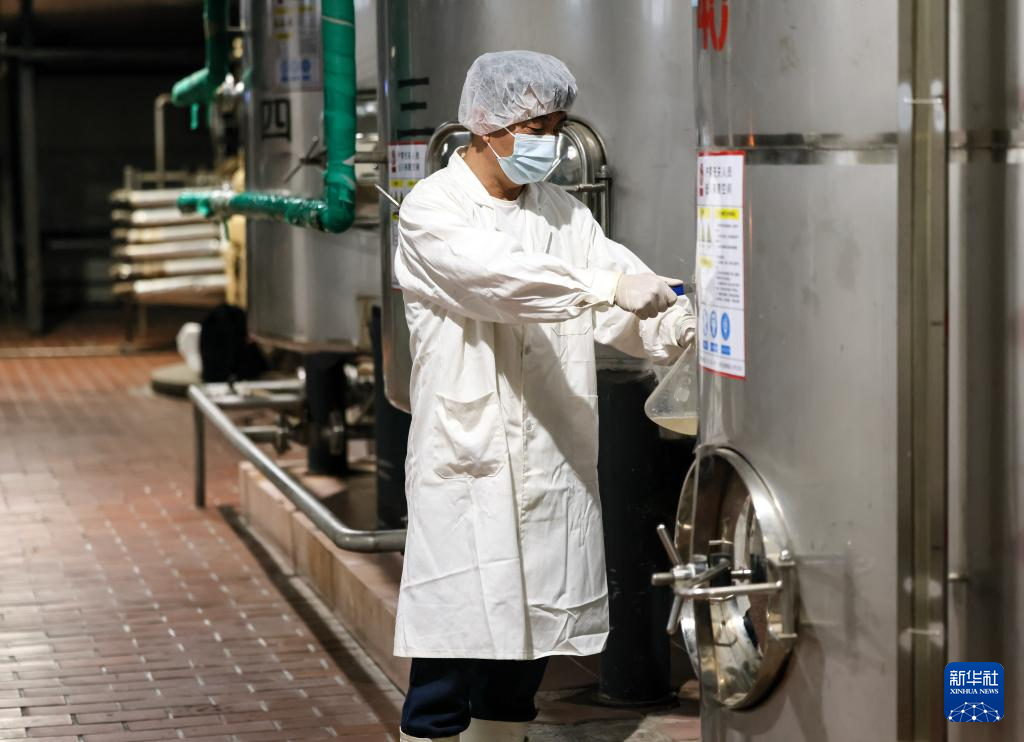 9月29日,在位于北京丰台区的龙门醋业有限公司制醋车间,质检员检查龙门米醋窖藏老醋的感官和风味情况。