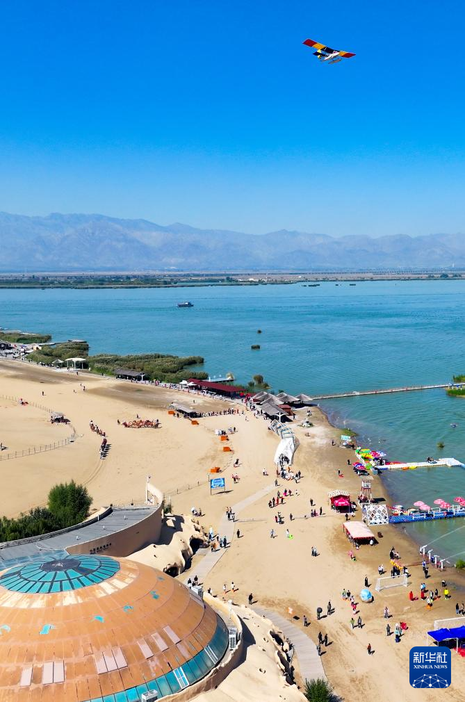 10月2日,游客在沙湖景区休闲、观光(无人机照片)。