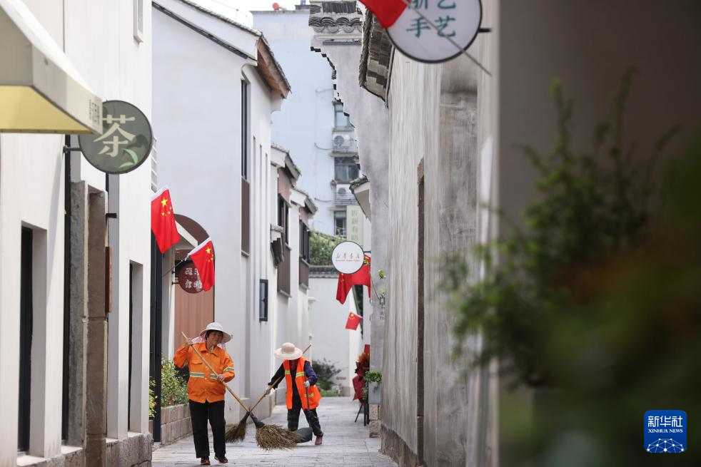 10月3日,环卫工人在浙江省湖州市德清县乾元镇赵家弄清扫保洁。