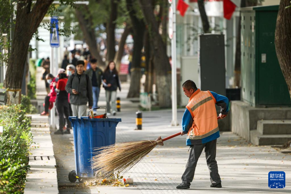 10月3日,一名环卫工人在乌鲁木齐市光明路上清扫落叶。