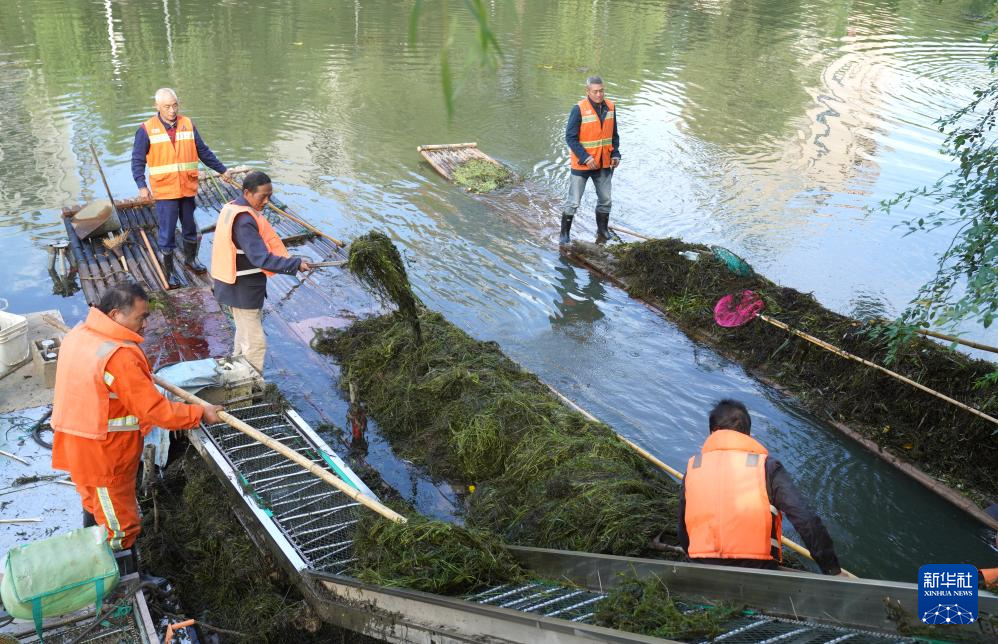 10月3日,浙江省湖州市河道清洁工在处理机械打捞船清理出的杂草。
