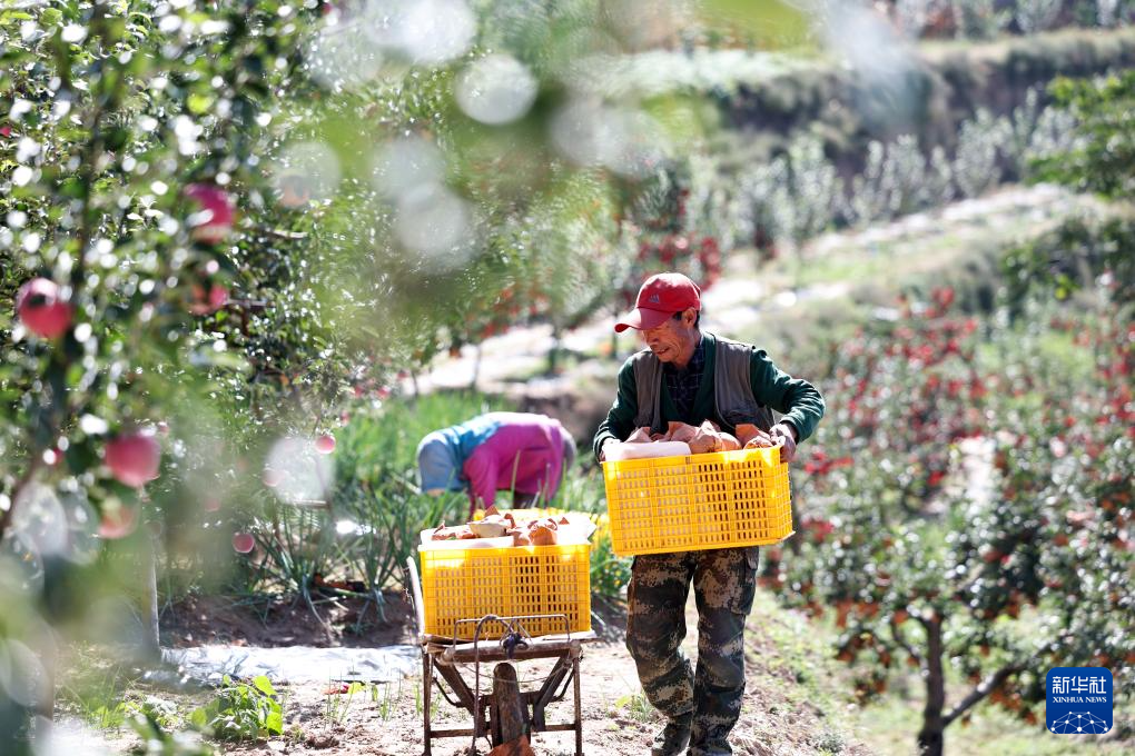 10月2日,甘肃省平凉市静宁县贾河乡侯山村的果农转运刚采摘下来的苹果。