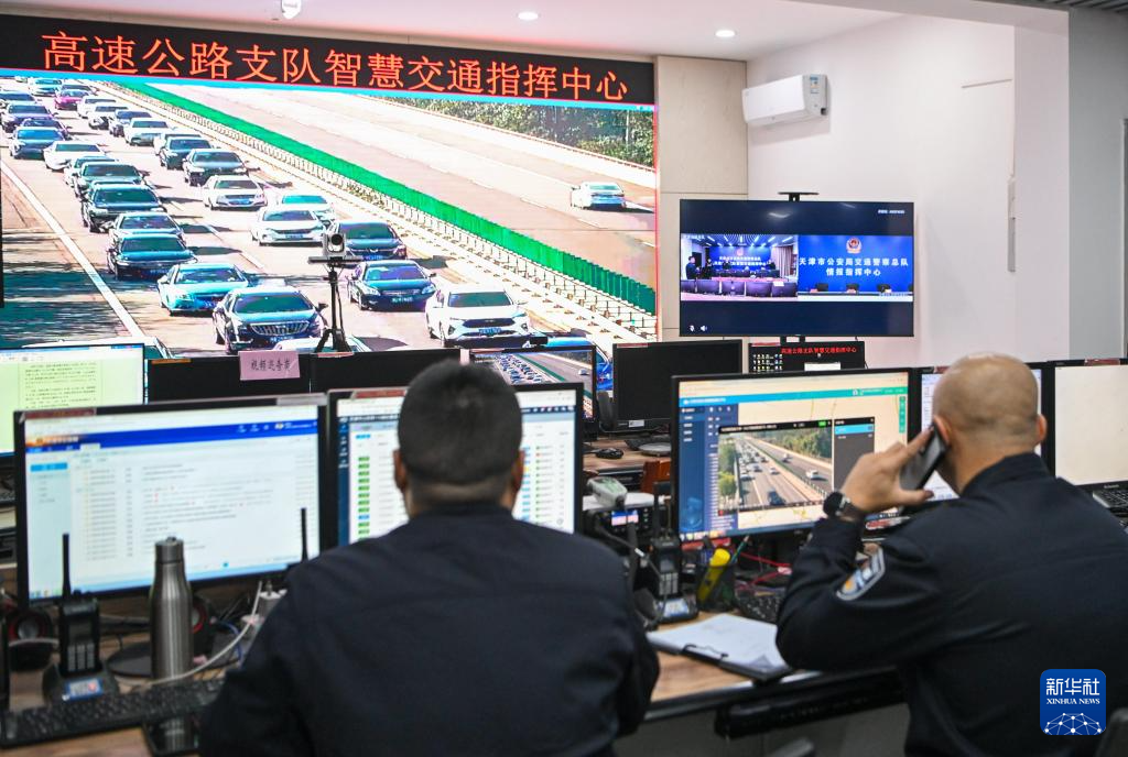 10月3日,值班干警在天津市公安局交通警察总队高速公路支队智慧交通指挥中心处理高速事故报警警情。
