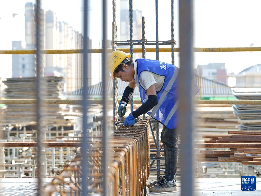 10月3日,中建二局工人在河北省石家庄市藁城区教育产业园区项目建设现场绑钢筋。