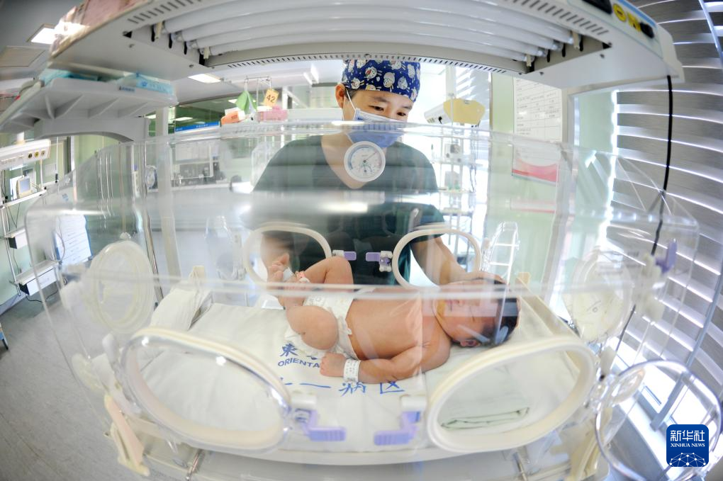 10月3日,在江苏省连云港市东方医院新生儿科,医务人员在岗位上忙碌。