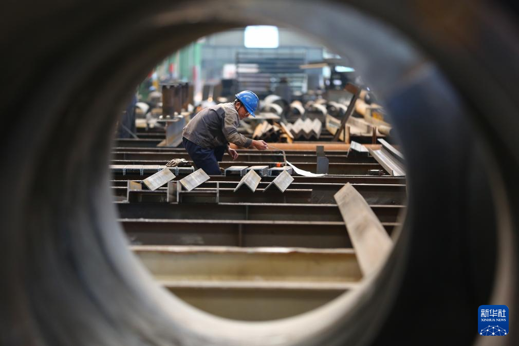10月3日,在山东省滕州市三维重工有限公司,工人在测量钢构件。