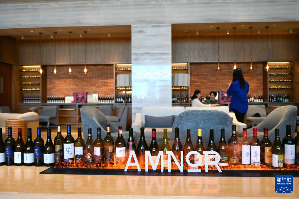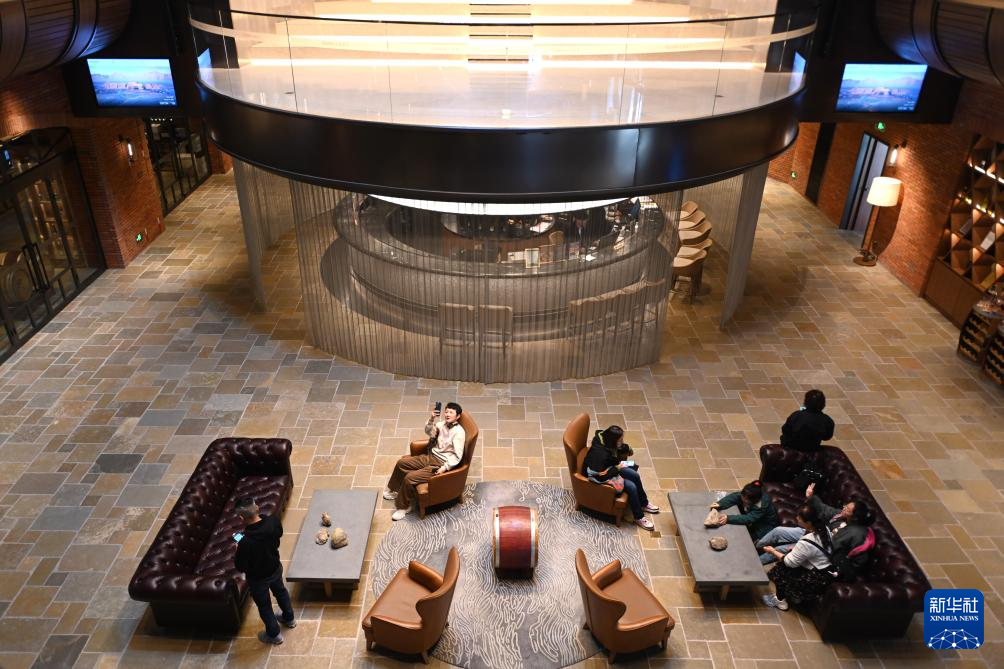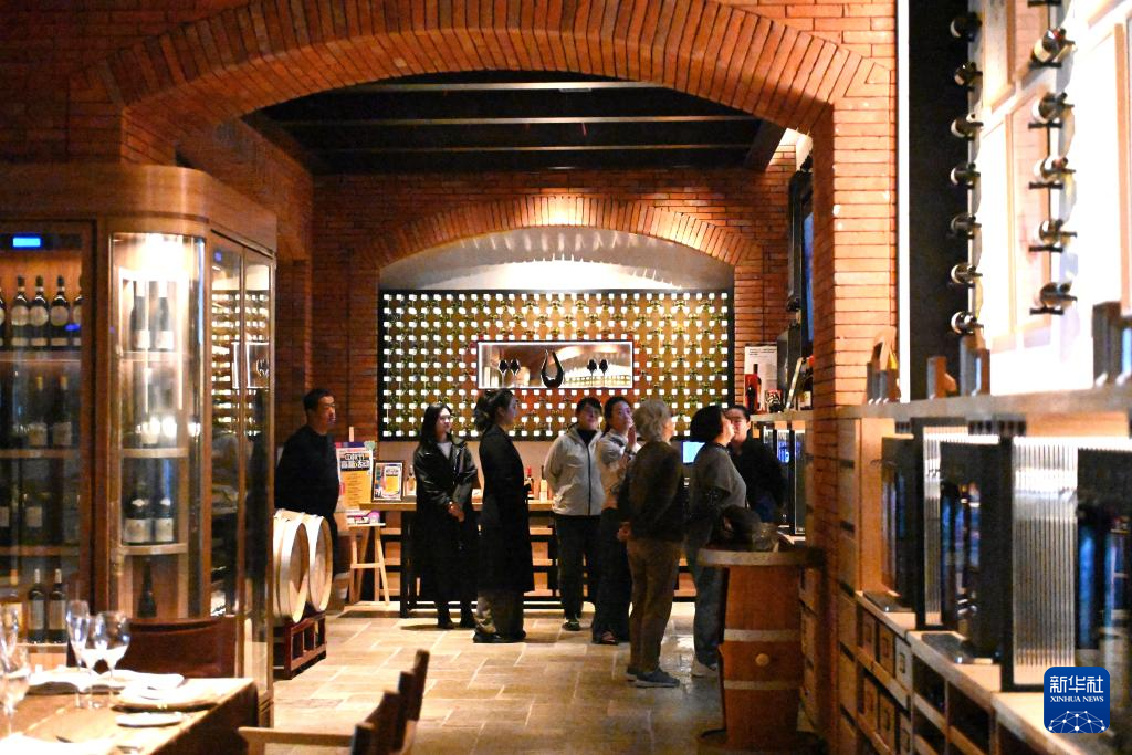 10月4日,游客在图兰朵葡萄酒小镇的酒廊参观各类葡萄酒。