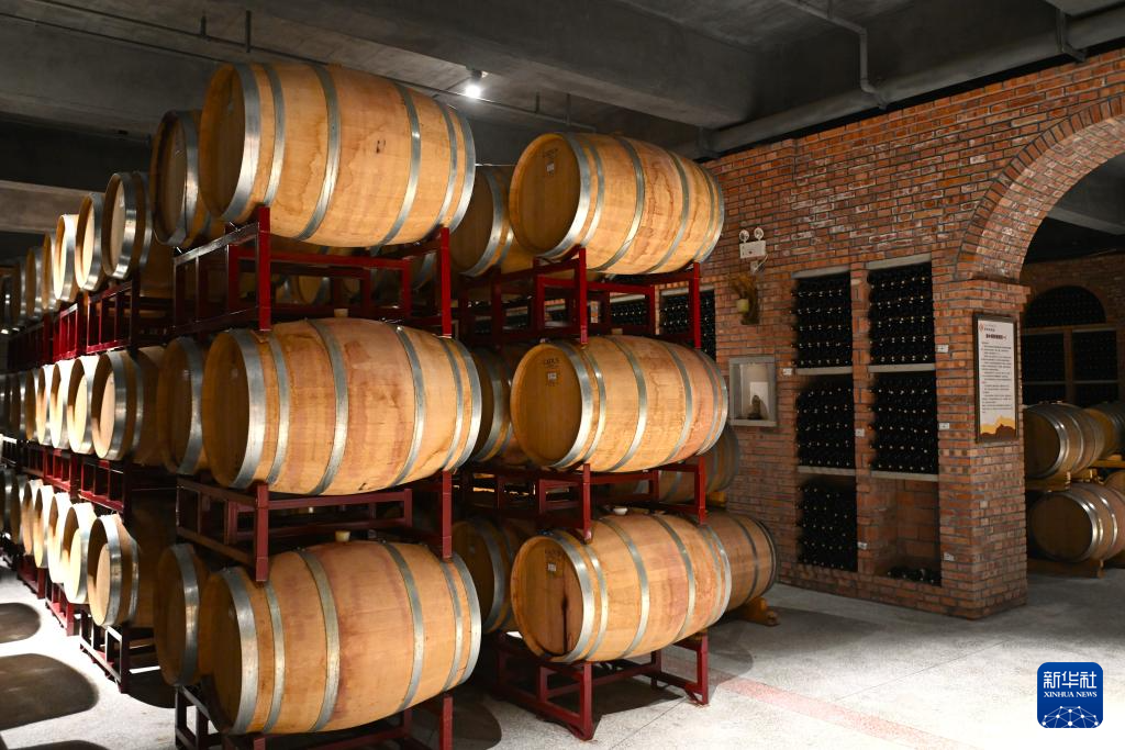这是10月4日在图兰朵葡萄酒小镇的酒窖内拍摄的酿酒橡木桶。