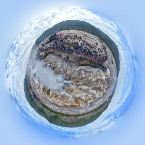 游客在黄河壶口瀑布游览(10月4日摄,无人机全景照片)。