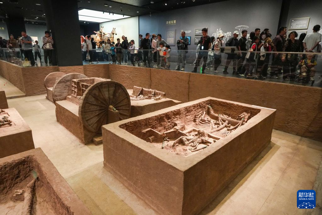 10月5日,游客在河北省邯郸市博物馆观看赵王陵二号陵出土的战国时期的青铜马。